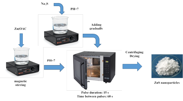 0.5 gr. of Zn(OAC)2 were dissolved in 100 ml distilled water and stirred by magnetic stirren to produce a clear solution. We prepared similar solution of 0.18 gr. Na2S in 100 ml distilled water by the same manner. The first solution had pH equal to 7 and the second was acidic. We put the Zinc acetate on a magnetic stirren and Na2S solution was added about 10 ml every 1 min. and after that, it remained on stirren for additional 10 minutes to complete the solving process. The solution remained for several minutes on table to start the precipitation. Then we centrifuged the sample and dried it in oven. The resultant sample was used as a control sample in our study. To determine the effect of heating on nanostructure of the products, we used microwave heating during the addition of Na2S solution, then all of products were centrifuged and dried.