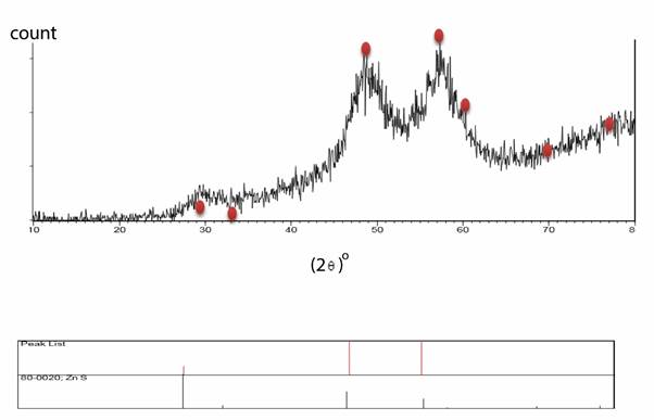 Fig. (4) shows diffraction pattern of X-rays from Carbon-ZnS nanocomposites. As seen the small peaks are related to Zinc sulphide nanoparticles. The presence of narrow and pointed peaks in comparison with fig. (3) indicates nanoparticles in nanocomposite are larger than nanoparticles in control sample.