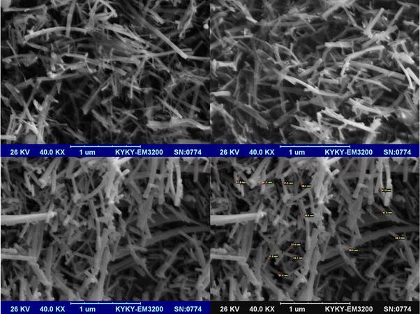 Figs. (9), (10) and (11) show the results of SEM analysis of samples prepared by microwave heating in the presence of organic surfactants of starch, gelatin and glucose respectively. Mean particle diameter were respectively 53, 49 and 53 nm. Particles formed by starch are more pleomorphic and whereas particles formed by glucose and especially gelatin are more uniform.