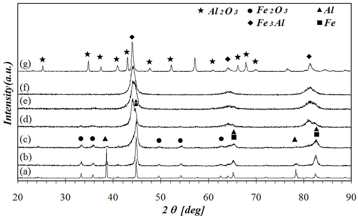 Moreover, the low peak intensity of Al2O3 can also be attributed to the X-ray absorption by the Fe3Al matrix as well as the lower volume fraction of Al2O3. Leonard and Koch [19] proposed that the intensity of diffraction peaks has a relation with the mass absorption of the materials in mechanically milled powder consisted of two or more phases. In this study, the Al2O3 peaks can be suppressed by Fe3Al-matrix because of the relatively higher absorption coefficient of Fe3Al (269.2 cm2/gm [15]) in comparison to that of Al2O3 (31.7 cm2/gm [15]).