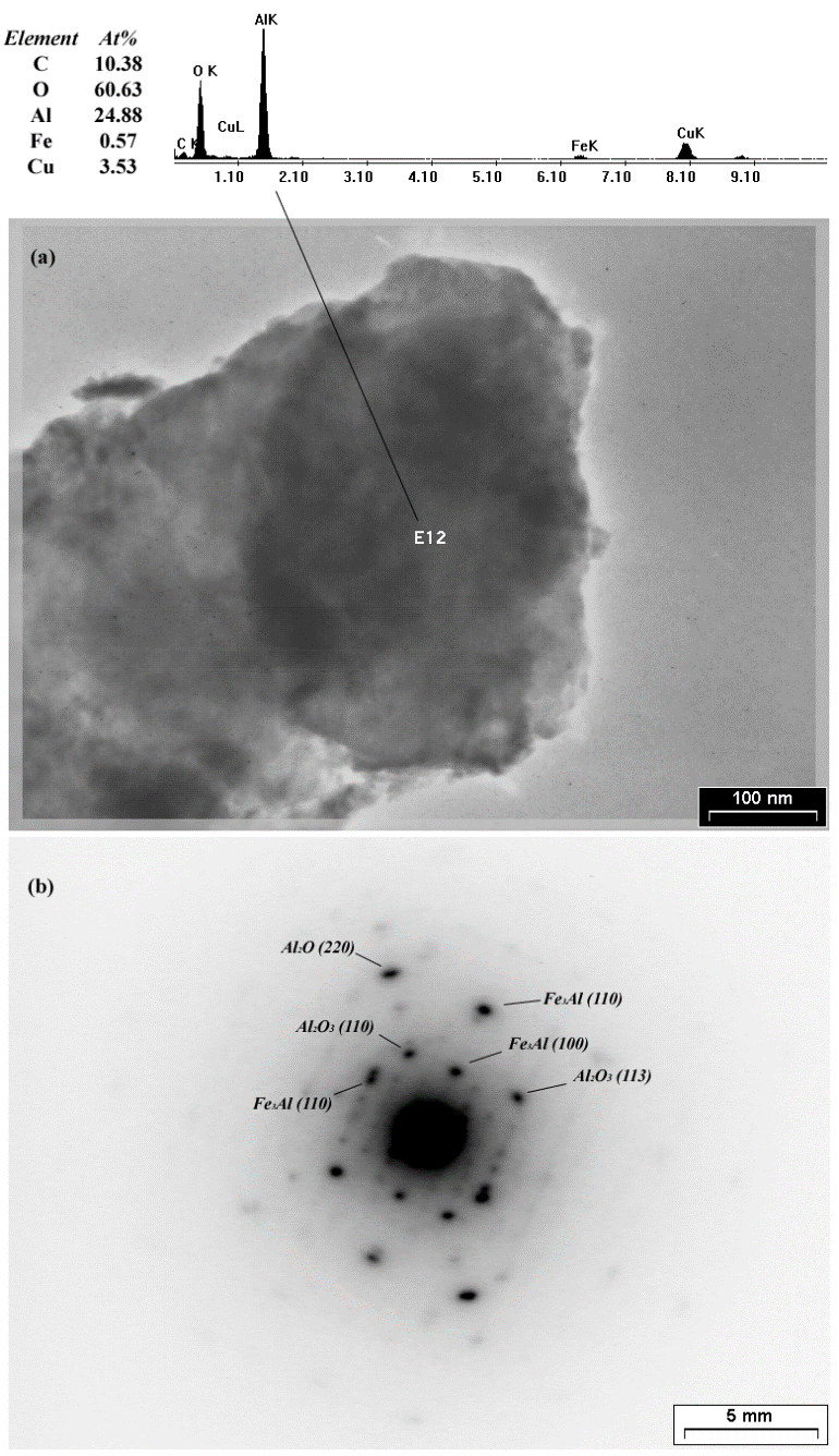 The Bragg peaks of Al2O3 are not observed on XRD pattern of final products (Fig. 1). The absence of Al2O3 peaks can be due to the amorphous structure of mechanochemically synthesized Al2O3 phase, which may be resulted from non-combustion (gradual) reaction mode. On the other hand, low volume fraction as well as the nano-scale crystallite size with high lattice strain of mechanochemically synthesized Al2O3 phase in this sample, could also be the reason. Hence, Electron diffraction and EDS analysis were performed using TEM to investigate the elemental analysis and crystallinity of the mechanochemically synthesized Al2O3 phase. The bright-field (BF) image of the mechanochemically synthesized Fe3Al-30 vol.% Al2O3 (MC-Fe3Al-30Al2O3) powder particle along with the EDS analysis and corresponding selected area diffraction (SAD) pattern are presented in Fig. 2. EDS analysis indicated some area with a high concentration of aluminum and oxygen elements corresponding to the Al2O3 phase. The spectra of carbon and copper are from carbon-coated copper grid. The corresponding SAD pattern showed no amorphous ring indicating that Al2O3 has a crystalline structure. Therefore, it can be concluded that the Al2O3 phase can be formed directly during the gradual mechanochemical reaction in the non-stoichiometry powder mixture of Fe2O3+Al+Fe and absence of the diffraction peaks of Al2O3 can be due to its low volume fraction as well as nanocrystalline nature of synthesized powders.