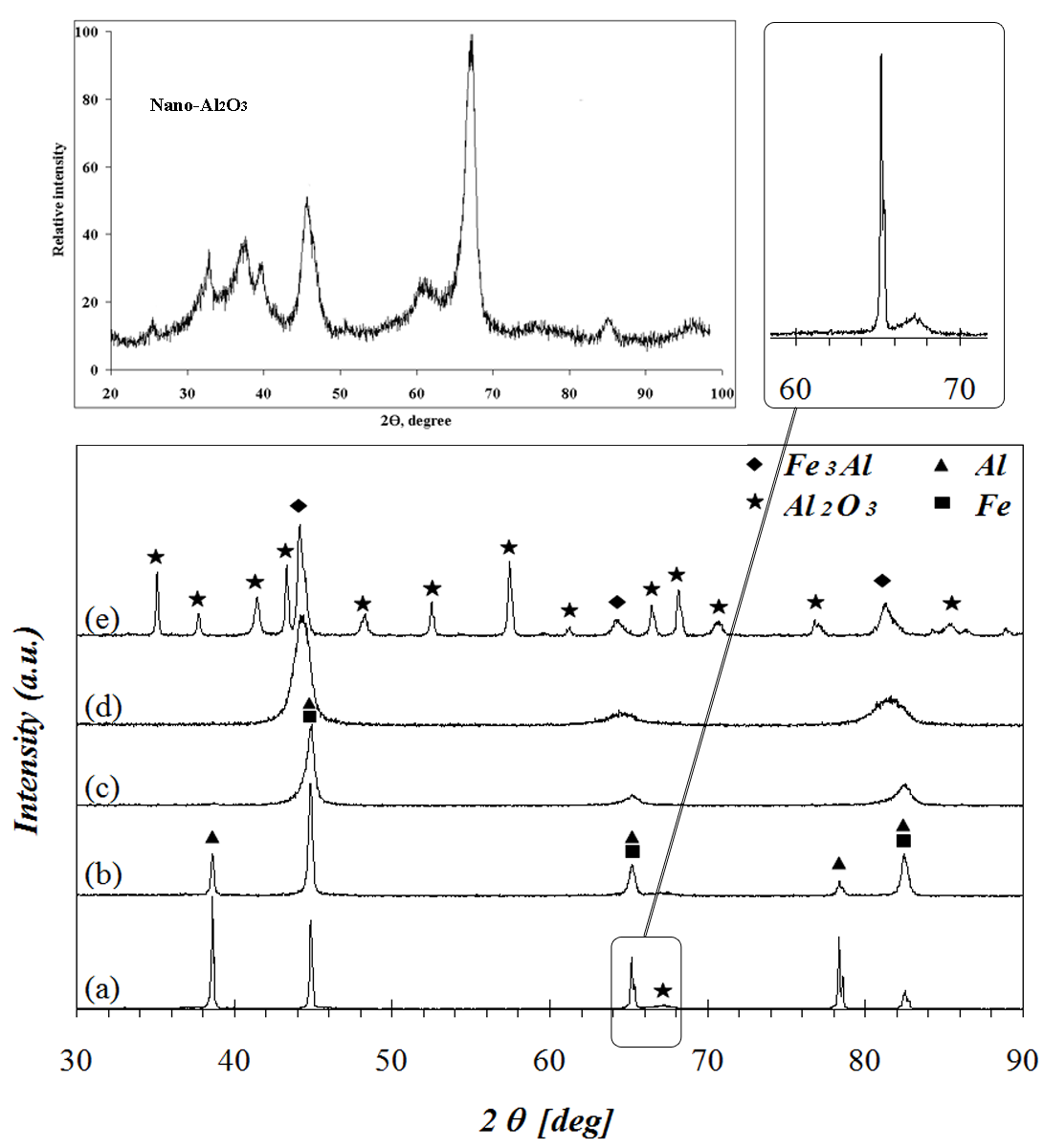 To investigate the effect of crystallite size as well as lattice strain on the XRD pattern, the Al2O3 nanopowder (n-Al2O3) was added to the Al+Fe powder mixture, and ball milled to synthesize the mechanically alloyed Fe3Al-30 vol.% Al2O3 (MA-Fe3Al-30Al2O3) nanocomposite powder. XRD patterns of n-Al2O3+Al+Fe powder mixture as-received and after different milling times are shown in Fig. 3. As seen, only one weak peak related to the Al2O3 phase are observed on the XRD pattern of the as-received sample. The XRD pattern of n-Al2O3 is given in the insetof Fig. 3 showing the crystalline structure of the n-Al2O3 phase with the highest intensity at 2θ = 67.4. The crystallite size of the n-Al2O3 powder was calculated by Scherrer formula to be about 10 nm. After 1 h of ball milling, the XRD peak of n-Al2O3 virtually vanished because of the broadening effect. After 20 h of milling time, the peaks related to the Fe3Al phase could be identified (Fig. 3 (d)). The crystallite size and average lattice strain of Fe3Al in MA-Fe3Al-30Al2O3 after 20 h milling time calculated from XRD pattern are 25 nm and 1.21%, respectively.