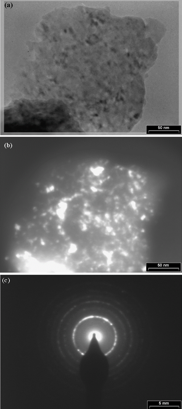 Refinement of crystallite size as well as increasing the lattice strain leads to the increase in the width of XRD peaks remarkably, while reduces their intensity [15]. These results indicate that the Al2O3 phase produced by mechanochemical reaction route (MC-Fe3Al-30Al2O3) tends to show no peaks on the XRD experiment. The nanocrystalline structure of MC-Fe3Al-30Al2O3 was also confirmed by TEM observations. Fig. 4 shows BF image, dark-field (DF) image, and SAD pattern from MS Fe3Al-30Al2O3 nanocomposite powder prepared after 20 h milling time. The corresponding SAD pattern exhibits the Debye-Scherrer rings which is the characteristic of a fine crystalline structure. The DF image suggests a crystallite size of < 50 nm which accords well with 40 nm estimated using the XRD pattern by Williamson-Hall approach.