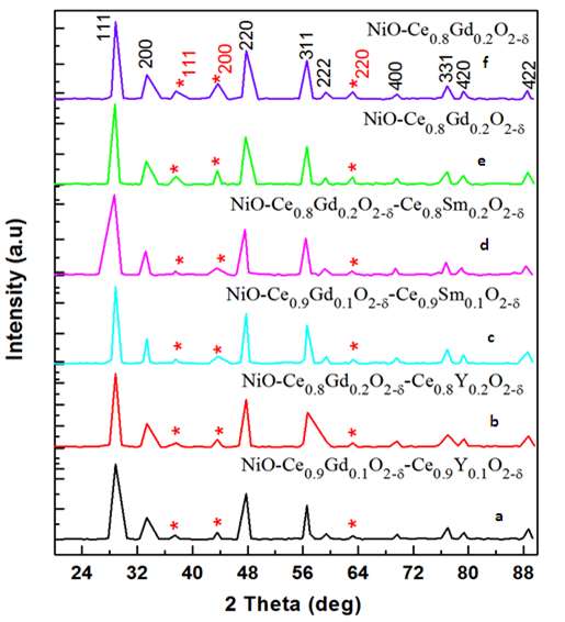 It was found that nanocrystalline based anodes can exhibit good catalytic activity, high electronic and ionic conductivity in turn which may help to achieve high power output. Yang Nai-Tao et al. have proposed new Ni-Ce0.8Gd0.2O1.9 (CGO) cermet anodes for IT-SOFC application [8,9]. They found that NiO in the anodes can be reduced to Ni completely by the mixture of 20%H2 ~ 80%He at 700 °C without the phase transformation of CGO. There are various processing routes for the synthesis of ceramic composite materials. Those routes include solid state route, sol-gel route, plasma spraying, laser synthesis, hydrothermal synthesis and co-precipitation route, green synthesis, combustion, microwave synthesis, thermal decomposition route, etc. [10-27]. In this research work, we report the preparation and characterization of a set of nanoceramic composite materials by a chemical precipitation route for application as alternate anode materials for SOFC systems.