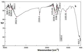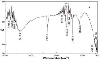 As seen from the spectra, only a prominent peak ~400 cm-1 is found. This peak represents to Ni-O stretching vibrations reported earlier [36].It is reported that pure CeO2 has shown a broad band at 1383 cm-1 [37].In our study, all the samples have shown the characteristic peak of CeO2 exactly at 1383.6 cm-1. The samples showed peaks at around 2360 cm-1, which may be due to the presence of dissolved or atmospheric CO2 in the sample [37]. The peak appeared at 1600 cm-1 is attributable to H-O-H bending mode and is indicative of the presence of molecular water in the samples [37]. The wide absorption bands that appeared in the spectra nearly at 3400 cm-1 are attributed to the stretching vibration of water H-O bond (moisture) [37]. The absorption of atmospheric CO2 and water molecule is common in CeO2 based materials [38].The bands in the region 1,000 to 650 cm-1 have been assigned to the stretching modes, and the region 650 to 450 cm-1contains bridging stretching modes in the samples [39]. The important peaks observed from FTIR spectra assigned for characteristic peaks have shown in the Table 5.