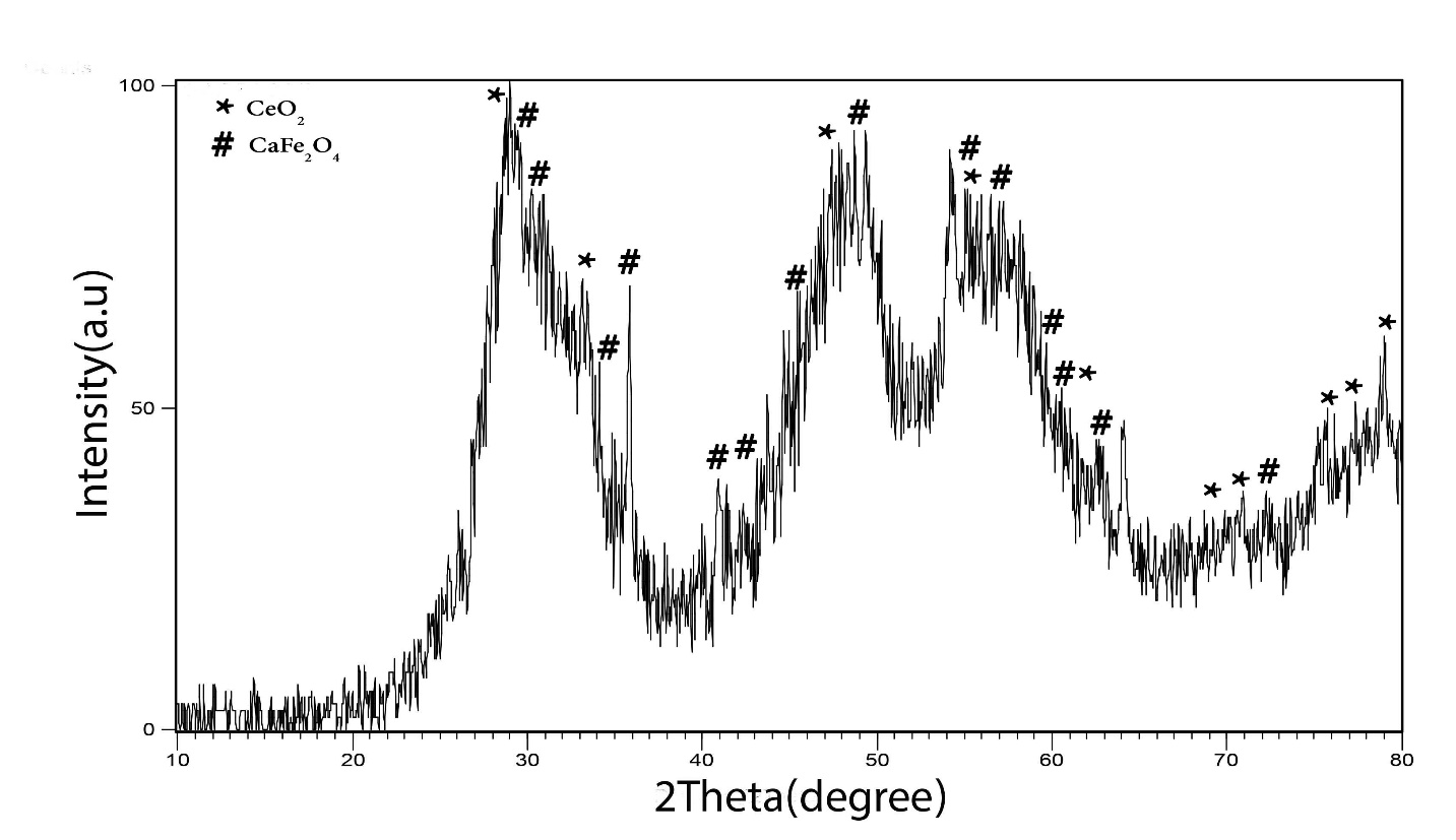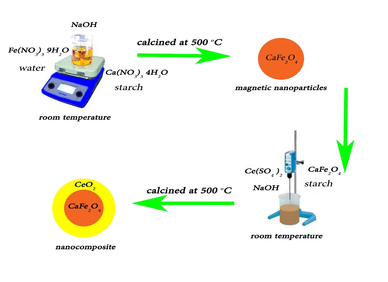 0.1 g of CaFe2O4 was dispersed in 200 ml of deionized water by ultrasonic waves (150 W, 8min). Then 0.4 g of Ce(SO4)2 was added. NaOH solution was slowly added to the aqueous solution until reaching pH to the 10 and was stirred for 30 minutes.