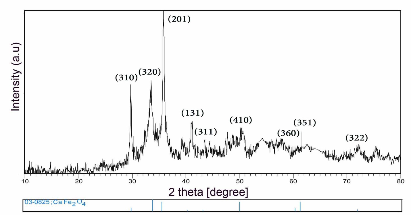 Fig. 5-d show SEM images of the calcium ferrite nanoparticles obtained applying gelatin surfactant calcinated at 500 °C. According to scanning electron microscopy images the average particle size is found to be around 41 nm.