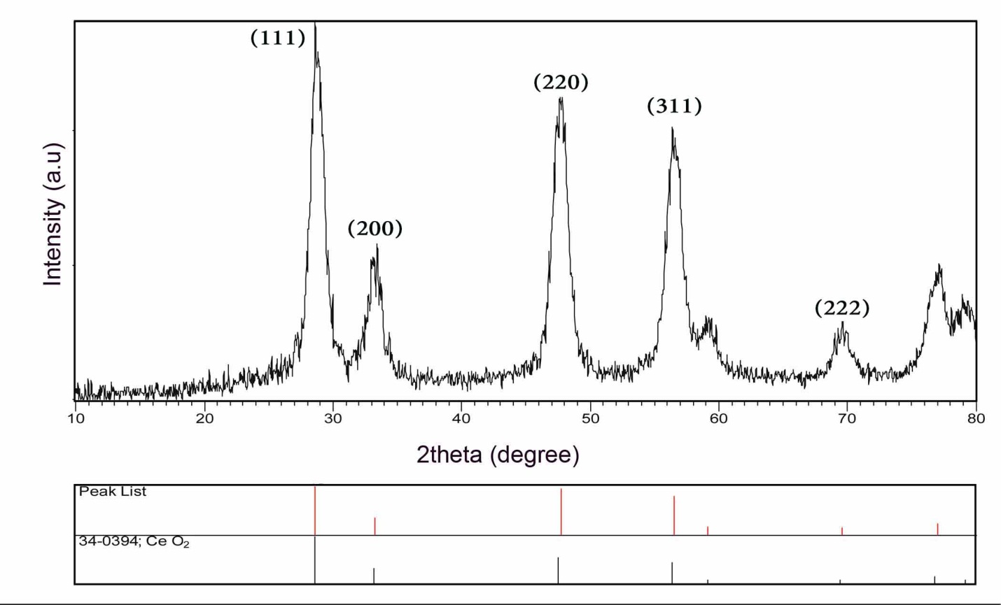 Cerium oxide one of the elements in lanthanide series is an excellent semiconducting material with a wide band gap which is familiar for its catalytic properties [17]. It is commonly used for enhancing efficiency or support in industrial catalytic processes due to its oxygen storage capacity [18].