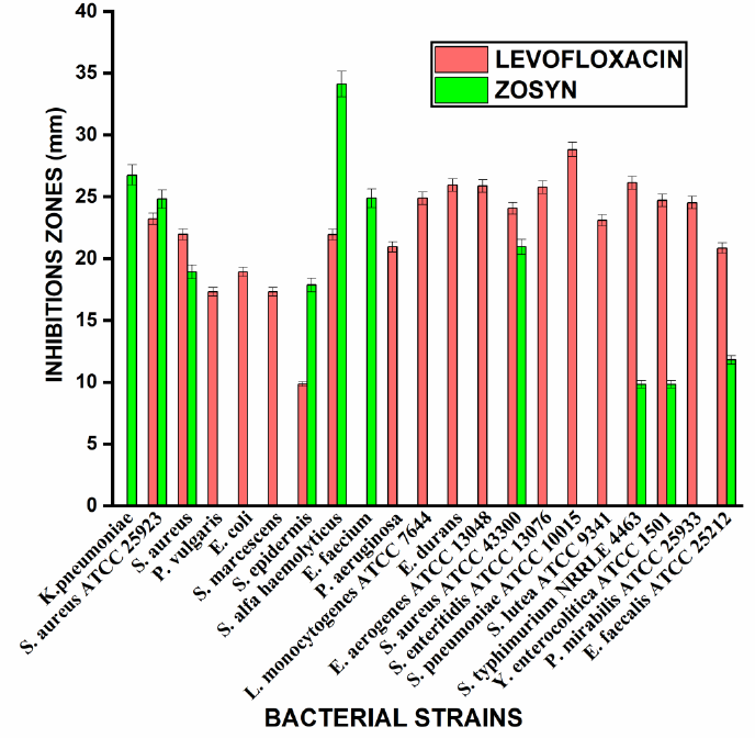 Levofloxacin is one of the group of antibiotics called fluoroquinolones. Zosyn is a combination of piperacillin and tazobactam that are broad-spectrum antibiotics. Levofloxacin is an effective agent against gram-positive and gram-negative bacteria. It is also preferred because it has a broad antimicrobial activity. It is first used in the treatment of many bacterial infections compared to ciprofloxacin. However, it is better than ciprofloxacin thanks to proven clinical effects such as the low incidence of adverse gastrointestinal reactions. DMSO was used as a negative control because it did not show any effect on all strains of bacteria used in this study. To clarify any participating role of DMSO in the biological screening, separate studies were carried out with the solutions alone of DMSO, and they showed no activity against any bacterial strains.