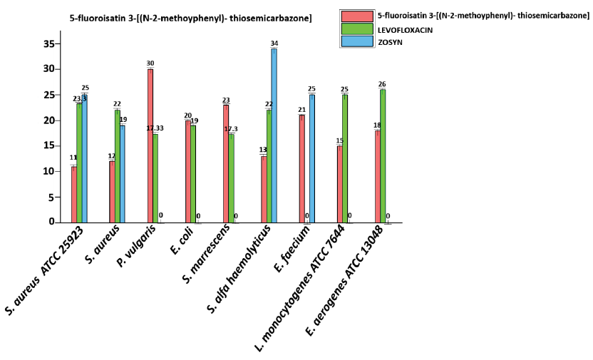 In this study, one metal complex of 5-Fluoro-isatin thiosemicarbazone was also created by adding zinc to the complex. It was called Although many articles suggest that the addition of some metals caused an increase in their effect on bacteria and inhibition zones, Compound 4 with zinc (II) did not show a wide range of antimicrobial activity. Compound 4 affected only one strain of gram-positive bacteria (E. faecium) with 9 mm diameter of inhibition zone and gave a better result than Levofloxacin based on their effect on E. faecium bacteria as shown in Fig. 5.