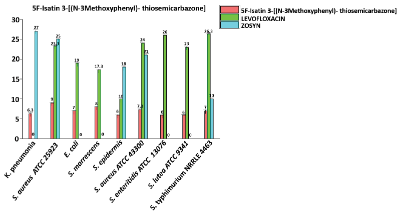 Compound 1 which contains N-4-methoxyphenyl with fluoro isatin and thiosemicarbazone did not show any effect on all types of bacteria strains, and no inhibition zone appear.