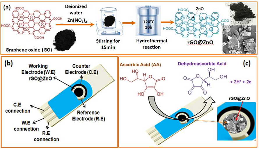 The detection of AA at bare conventional electrodes in electrochemical technique, generally foul the electrodes due to the strong adsorption of 2,3-diketogluconic acid formed by irreversible oxidation reaction of AA[14]. Therefore, for the design and development of long lasting electrochemical sensors, the bare electrodes have to be suitably modified using nanomaterials, which are able to provide the redox active site for effective sensing bio-molecule. So, the development of novel nanomaterials, to solve the above issues of electrode is at most urgent and has become a challenging research problem[15]. In-line with, several type of nanomaterials, such as Titanate nanowires[16], silver and carbon nanoparticles[17], Ni(OH)2/AuNP/SPE [17], Cobalt-Coated Si Nanowire Electrodes[18], CuO/Pt nanocomposites [19], ZrO2/rGO [20], have been used for the modification of conventional electrodes. Li Fu et al have developed RGO–ZnO-modified GCE for electrochemical sensing of uric acid [21]. Using costly (Pd/PEDOT) nanocomposite, Fengxing Jiang et al have modified glassy carbon electrode (GCE) for the detection of hydrogen peroxide(H2O2).[22] Unfortunately, due to their scarcity, high cost, sensitivity, detection limit, selectivity, linear responses in narrow concentration ranges, and less stability, developing a nanomaterial elelctrocatalyst to address these issues is still a great challenge for materials researchers. To address these issues, we have made sincere effort to develop low cost, highly sensitive and stable nanocomposite consisting of rGO@ZnO for the first time as electrochemical sensing platform for ascorbic acid.