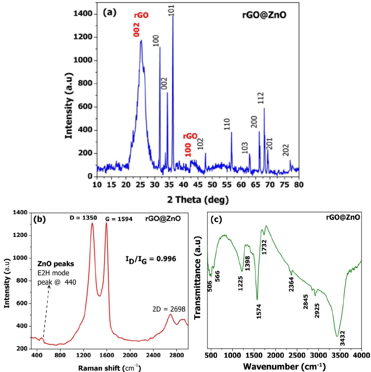 The XRD patterns of the as-prepared rGO@ZnO are shown in Fig. 2(a). The characteristic peaks of rGO, such as a broad peak at 2θ=25°, matching to (002) plane of rGO, (JCPDS 75-2078) is evident for complete conversion of GO into rGO. The XRD spectrum of rGO@ZnO hybrid depicts peaks at 31.53°, ٣٤.23°, ٣٦.25°, ٤٧.52°, ٥٦.٦°, ٦٢.83°, ٦٦.37°, ٦٨.05°, ٦٩.06° and 76.97° which correspond to the (١٠٠), (٠٠٢), (١٠١), (١٠٢), (١١٠), (103), (200), (112), (201) and (202) crystalline planes of ZnO, respectively. This confirms the wurtzite structure of ZnO (JCPDS No.36–1451)[47]. No other reflection peaks, except rGO and ZnO peaks, in the XRD pattern, reveals the absence of impurity phases. Moreover the appearance of intense peaks of rGO and ZnO, strongly confirms the successful formation of hybrid nanocomposite[50].