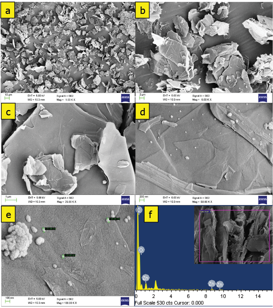 The morphology and microstructure of the rGO@ZnO nano composite was investigated using FESEM, as shown in Fig. 3. It can be clearly seen in Fig. 3(a) that the rGO@ZnO nano composite appears to be more uniform in terms of microstructure, which has major impact on electrochemical sensing mechanism. The uniform microstructure helps is effective sensing, due to uniformly distributed active sites in the nanocomposite powder. Highly magnified FESEM images Fig. 3(b-e) clearly confirm the graphene sheets embedded on each other along with ZnO nano particles. The size of aggregated ZnO nanoparticles distributed on graphene sheets is found to be 20-60nm. The composition of rGO@ZnO nano composite is further confirmed by EDS analysis, corresponding image is shown in Fig. 3(f). The EDS spectra confirms the presence of all the expected elements such as ‘C’, ‘O’, and Zn, with no other elements.