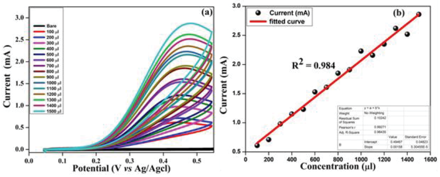 The electrochemical behavior of rGO@ZnO nano composite modified SPE towards ascorbic acid was studied in phosphate buffer of pH = 7.0 using cyclic voltammetry. The observed results were shown in Fig. 4a. No oxidation peak appeared in presence of ascorbic acid for bare SPE indicating the no sensitivity. Whereas, the rGO@ZnO nano composite modified SPE shows an oxidation peak at around 0.42 V demonstrating the ability to sense ascorbic acid. Further, the sensitivity of the rGO@ZnO nano composite modified SPE towards ascorbic acid concentration has been tested. The results shown in Fig. 4b indicate as the concentration of ascorbic acid increases, the oxidation peak current increases linearly with R2 =0.984. Further, the proposed rGO@ZnO nano composite modified SPE exhibits wide linearity from 0.1 mmol to 1.5 mmol. Thus, this proposed rGO@ZnO nano composite electrochemical sensor could be used for the detection of ascorbic acid from the real samples.