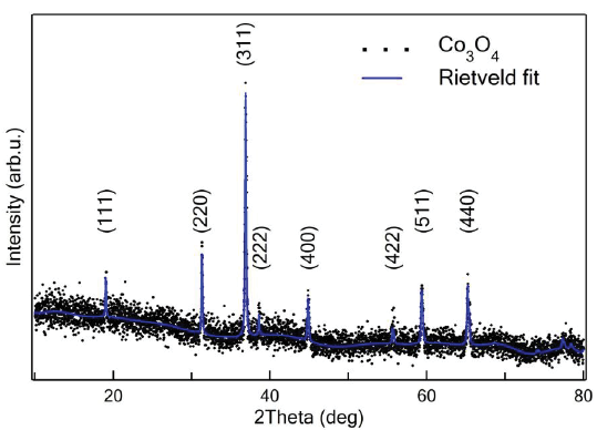 X-ray diffraction (XRD) pattern of Co3O4 nanoparticles is shown on Fig. 1. In this pattern, there are several peaks at 2θ ≈ 18.99º, 31.26º, 36.83º, 38.54º, 44.80º, 55.64º, 59.34º and 65.21º which indicates the spinel with cubic face centered structure of Co3O4 with standard diffraction data of card no. JCPDS = 01-080-1532. The structure was refined by Rietveld fit in crystallographic program Jana2006 [20] that confirmed the lattice parameter a = 8.085 Å. The size of crystallites was determined in the same program using fundamental parameter approach [21], which removed the instrumental part of the diffraction pattern by means of known geometry of the difractometer. The average crystallite size for Co3O4 nanoparticles was found 77 nm.