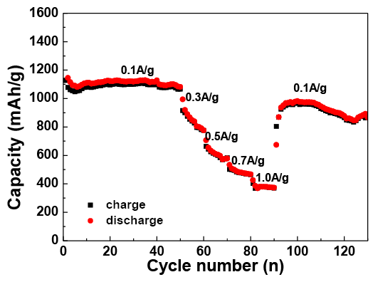 As shown in Fig. 3a, the reduction peak around 1.17, 0.92, 0.82 V in the first cycle can be associated with reduction of Co3+ → Co2+, Co2+ → Co and formation of Li2O and solid electrolyte interface (SEI) [5, 6]. The oxidation peak around ∼2.0 V can be attributed to the oxidation of Co → Co3O4 and decomposition of the SEI. In the following cycles, the redox peaks are well overlapped which means that Co3O4 anode has high cycling performance (Fig. 3b). Fig. 4 shows capacities at different current densities of 100–1000 mA g-1. Co3O4 sample shows 1st discharge capacity of 1996 mA h g-1 and charge capacity of 1127 mA h g-1 [22]. The irreversible capacity loss is caused by the formation of SEI and electrolyte decomposition. At current density of 1000 mA g-1, the discharge capacity is 380 mA h g-1. The high capacity of the Co3O4 electrodes can be attributed to high specific surface area which provides more active area that can react with Li+ ions [23,24]. The cycling performance was used to prove the stability of the as-formed samples. As shown in Fig. 4, the discharge capacity is 868 mA h g-1 after 130 charge-discharge cycles with capacity retention of 76%, compared with reversible capacity of 1145 mA h g-1. The decline of electrode performance may own to destroy of electrode materials or the change of electrode structure [25, 26].