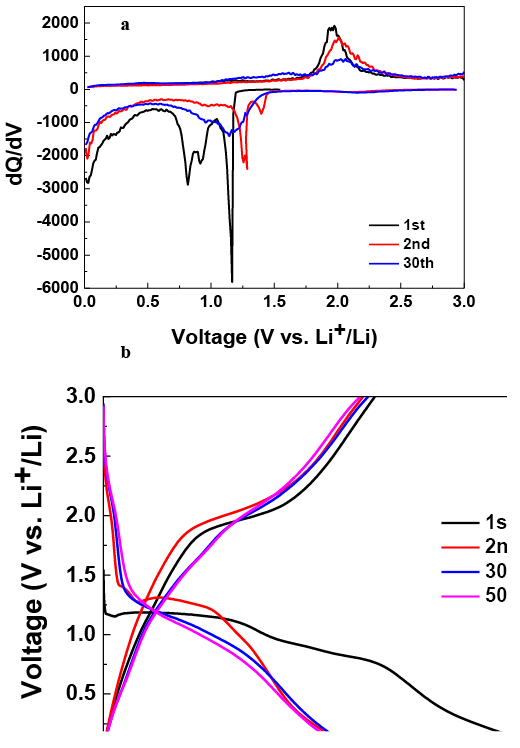 In summary, Li-ion battery anodes based on Co3O4 nanoparticles show better electrochemical performance. The 1st discharge capacity was 1996 mAhg-1 and charge capacity was 1127 mA h g-1. Also, Co3O4 sample shows decent cycle stability with specific capacities of about 868 mA h g-1 at 100 mA g-1 after 130 charge-discharge cycles. The high capacity of the Co3O4 electrodes can be attributed to high specific surface area which provides more active area that can react with Li+ ions.