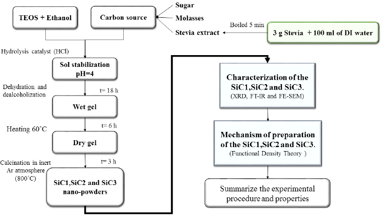 Tetraethyl ortho-silicate (TEOS Merck) was used as silicon source and the carbon sources were sugar, molasses and stevia. Also ethanol was used as solvent and hydrochloride acid (HCl Merck) as catalyst. Extract stevia was produced with thirty grams of powder of dried leaf of stevia, that was boiled in 100 ml of distilled water for 5 minutes. The details of this method are explained in the previous work [20]. Each carbon source (sugar, molasses, and stevia extract) with a constant ratio of 0.6 is mixed with other materials. In order to complete the hydrolysis reaction, the as-prepared solution was kept in an isolated place for 18 hours. Resultant gels were kept in the hot air oven for 4 hours in 60˚C to dry as shown schematically in