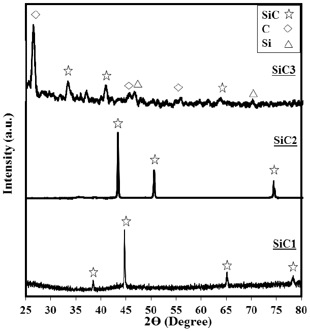 Where β is FWHM (full width at half maximum) of the peaks, θ is the Bragg’s angle and λ = 1.54. For crystallite size calculations, β is measured from (111) plane of SiC using the XRD pattern in Fig. 3. The calculated crystallite size of SiC, using the above equation was respectively 42.7 nm, 43.3 nm and 35.5 nm for the SiC1, SiC2, and SiC3.