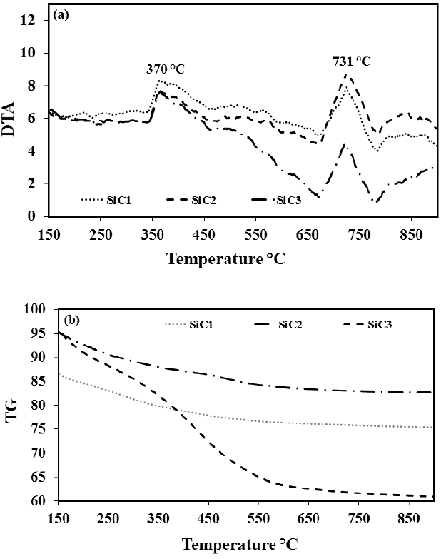 Fig 4 illustrates the thermal analysis of the gel samples. From DTA analysis (Fig. 4a) it can be seen that all samples undergo similar reactions. The first endothermic peak at 160°C is due to dehydration of the sample (including the removal of the structural water) [8]. This endothermic reaction is followed by two exothermic reactions at 370 °C and 731 °C, which leads to SiC nano-powder formation (Fig. 4a) [67]. Thermogravimetric analysis of the samples (Fig. 4b) shows a secondary weight loss for the SiC3 sample, which could be due to the removal of carbon content or other volatile materials instead of the reaction of carbon with silicon. This carbon removal will reduce the amount of carbon available for SiC formation which consequently raises the amount of silicon contamination. This result confirms the XRD result, which shows huge amount of silicon contamination existed in the SiC3 sample. Among three samples, the SiC2 sample has the sharpest peaks related to exothermic reactions (Fig. 4a) and also undergoes lesser weight loss due to water removal. These phenomena facilitate the SiC nano-powder formation, as it can also be seen in XRD patterns.