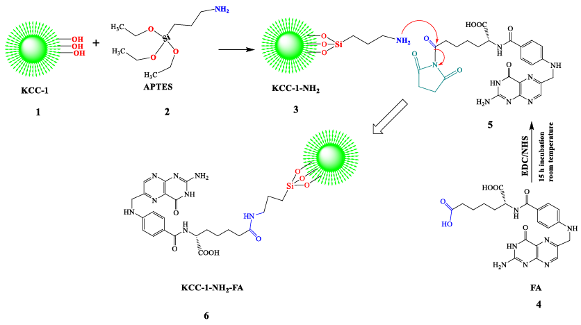 In continue, 190 mg of KCC-1-NH2 nanoparticles were mixed with 30 mL of PBS (pH 7.0, 55 mM) and next 15 mL of the synthesized FA-NHS solution was mixed with the solution. Next, the mixture of KCC-1-NH2 and prepared folic acid-NHS was stirred at room temperature for 6 hr. After that, KCC-1-NH-FA white-yellow precipitate was filtered and washed several times with deionized water and dried at 60 °C.