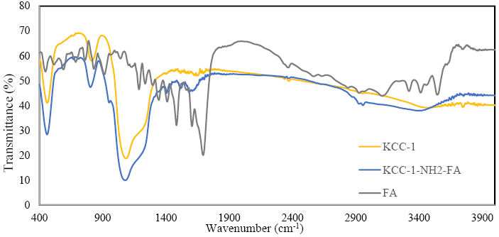 The process of functionalization of the KCC-1 with NH2 and FA moieties was monitored by FT-IR spectrums. As could be seen in Fig. 3, the typical transmittance peaks of silica-based composites could be attributed in the range of 1020-1110 cm-1 signifying the asymmetric stretching of Si-O-Si mode. Also, Si-OH spectrum which located at 960 cm-1 denotes the asymmetric bending and stretching vibration. However, peak at around 1500 cm-1 is related with amide II bonds between carboxyl’s of FA molecules and amine’s of KCC-1-NH2 [41,58].