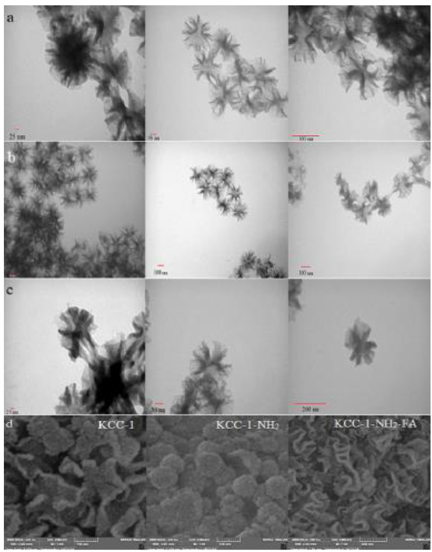 In order investigating the surface morphology and size of nanoparticles, FE-SEM and TEM images of the KCC-1, KCC-1-NH2 and KCC-1-NH-FA were recorded (Fig. 4 (a, b and c)). The TEM and FESEM pictures showed the fibrous shape, morphological and structural features of the nanoparticles which approximate average sizes of KCC-1, KCC-1-NH2 and KCC-1-NH-FA are determined to be about 175, 190, and 200 nm, respectively.