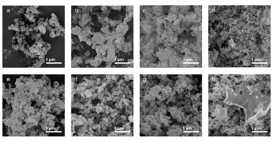 More information regarding the morphology of prepared materials was obtained by the scanning electron microscopy (SEM). As shown in Fig. 2 the MPTS/MSMs samples show different morphologies depending to the synthesis procedure from spherical-like to plate-shaped structures. The MPTS/MSMs-i sample with an average sizes less than 200 nm are spherical like, while in MPTS/MSMs-vii sample a mix of spherical and plate shaped structures are observed.