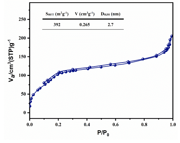 Nitrogen adsorption‒desorption isotherms were recorded to study the surface properties and the pore size distribution of mesoporous MPTS/MSMs-vii sample (Fig. 4). The BET surface area and total pore volume were calculated as 392 m2/g and 0.265 cm3/g, respectively. N2 adsorption-desorption analysis of MPTS/MSMs-vii demonstrate a type IV isotherm with H2 hysteresis, confirms the spherical-plate mixture structure of the adsorbent [23].