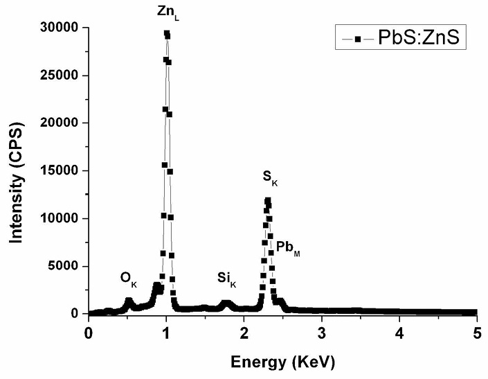 Lead sulfide doped zinc sulfide (PbS:ZnS) thin films were prepared on glass and Si(100) substrates using simple thermal evaporation technique. The ZnS powder (high purity) was used as source material. The PbS powder (6 wt %) was added to ZnS (94 wt %), under a vacuum of 10-5 Torr. The substrate holder heated before deposition to 200oC [22]. Thickness, as well as, thin films morphology were measured by means of SEM ,TSCAN Vega\\XMU model, equipped with EDX to determine the chemical composition of the synthesized films. X-ray Diffraction ( Stoe Transmission X-ray diffractometer Stadi P) has been used for structural properties [22]. The optical properties have been examined using the UV-Vis Shimadzu UV-310PC spectrophotometer of the elaborated films. laser He-Cd (A 325 nm wavelength) a 1m Spex monochromator was used get of the photoluminescence (PL) measurement at room temperature. The Fourier transform infrared (FTIR) spectra of the films were recorded by Jasco 300 E [32] spectrometer with a resolution of 4 cm−1. HRTEM with EDX mapping and typical modes were utilized to obtain the elements composition.