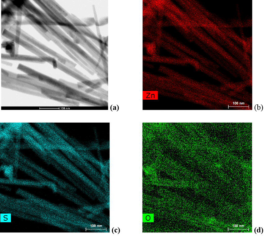 EDX mapping was carried out for TEM images (Fig. 1 b, c and d) of Zn, O and S elements, this analysis has confirmed that the nanowires are mainly composited of Zn and S elements. However, the wires are clear and determined, while the O element is low and it is a contamination (small quantity). This result was confirmed in EDX using SEM percentage in next paragraph (less than 6 % atomic percentage).