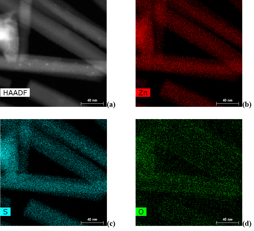 Fig. 1 presents HRTEM mapping images for EDX analysis (b) for Zn element, (c) for S element and (d) for O element. Such very thin ZnS and ZnO nanowires have not often reported in the literature [33-36]. However, most of the synthesizing processes involve more than one step in order to obtain the desired thin NW`s in our case, The synthesis of these NWs was conducted by the simple thermal deposition technique.