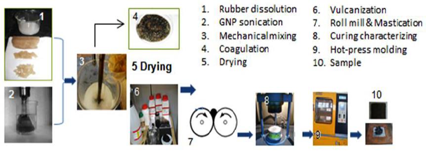 There has been a lot of research demonstrating that the direct melt blending is not sufficient for the considerable dispersion quality and high properties of GNP/elastomer nanocomposites. Several modified solution-mixing methods have been improved, which indicated a significant development when comparing with direct mixing [11-14]. Overall, the main concern in the fabrication of GNP/elastomer nanocomposites is the homogeneous dispersion of GNP in the matrix of rubber [15].