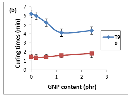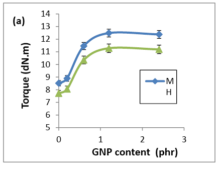 When the filler disperses in several polymers, it can form a network, which can constrain the mobility of the polymeric chains [32]. Adding 0.2 to 1.2 phr of GNP in GNP/NBR nanocomposites showed an increase in the values of MH and torque at 90% of the curing (M90), as shown in Table 2 and Fig. 3-a. The enhancement in the values of the torque is usually related to the rubber chains crosslinking degree, which increases the crosslinking density of the composite. Thus, it is contributed to the stiffness of the rubber nanocomposite. However, the low increase in the torque values at low contents were attributed to the low viscosity of the mixture. This might be due to the lubricant property of the graphene derivatives [21, 33].