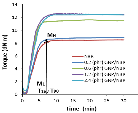 The torque-time curves in Fig. 2 showed the cure characteristics of NBR and GNP/NBR nanocomposite with different contents of GNP at T=160oC. Generally, the minimum torque (ML) of all samples in the rheometer was tending to decrease initially during the short time of scorch time (Ts2) due to the softening of the rubber before the thermal curing. Subsequently, the torque increases up to the maximum (MH) during the first 5 minutes due to the crosslinks formation of the rubber chains for all the samples. This is due to the interaction of the vulcanization additives with the initiators of NBR rubber chains. The torque values then reached the plateau, which indicates the completion of the curing at T90 (time taken for obtaining 90% of the curing).