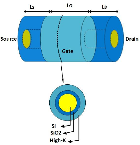Fig. 1 depicts a schematic view of GAA-FET device understudy. The cross section of this structure is circular. The silicon semiconductor channel has been covered by 0.5 nm silicon oxide and these two layers have been surrounded by 1nm high-k dielectric. This is due to better matching and interface quality of Si-SiO2which is formed in the fabrication process. All parameters of the physical and dimensional parameters related to this work are presented in Table 1.