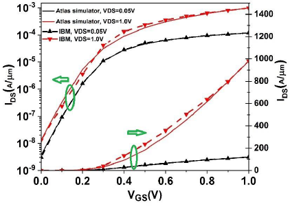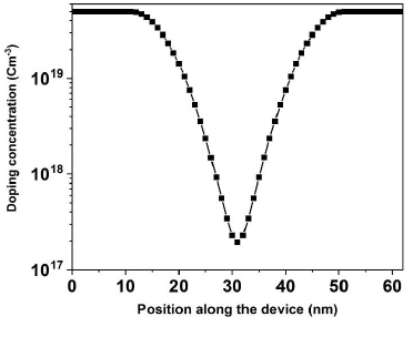 Silvaco ATLAS simulator can predict the electrical characteristics of semiconductor devices at different bias conditions [35]. To have reliable results we first calibrated the simulator against experimental results from IBM as presented in [36], [37] and [23]. For this we estimated the 40.21 nm perimeter of silicon channel reported in [37] by a circle with radius of 6.4 nm and then fitted its electrical characteristics by setting conduction band effective mass and mobility for electrons. Fig.2(a,b) depict transfer characteristics (ID-VGS) and Gaussian like doping profile incorporated in the device for calibration at two low and high bias points corresponding to VDS=0.05 V and VDS=1.0 V, respectively.