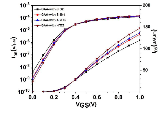 It should be noted that the aim of this work is prediction and evaluation of the electrical characteristics of the calibrated GAA-FET with different high-k materials in terms of ON-current, OFF-current, subthreshold slope and transconductance.