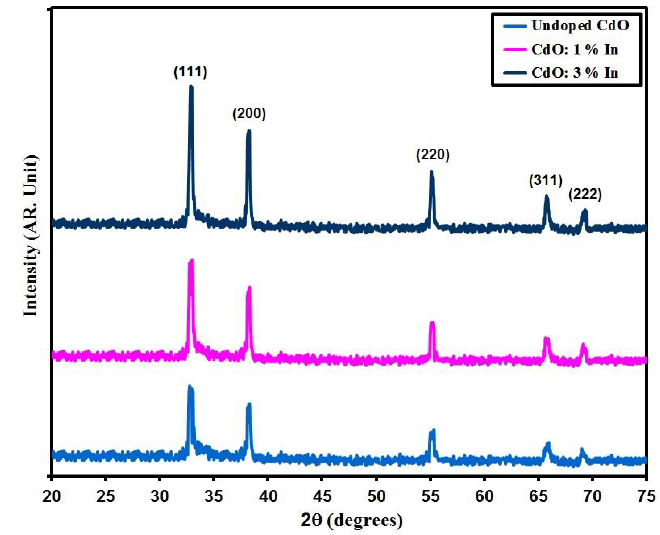 The nano-sized CdO thin films were synthesized from 0.1 M of CdCl2 (in deionized water and ethanol in a 1:1 ratio) as a precursor. The indium trichloride was separately dissolved in 10 ml of deionized water and then HCl (12 M) was added dropwise to the solution to get a clear solution. Next, the In3+(aq) was added to the Cd-based solution as a doping reagent. Finally, the prepared solution was subjected to spray pyrolysis conditions. The conditions were set as: substrate temperature 350 °C, spraying period 8 s endured by 60 s to abstain from cooling, shower rate was 4ml/min, the separation between the nozzle and the substrate was 28 cm. Also, nitrogen gas was used as a carrier gas.