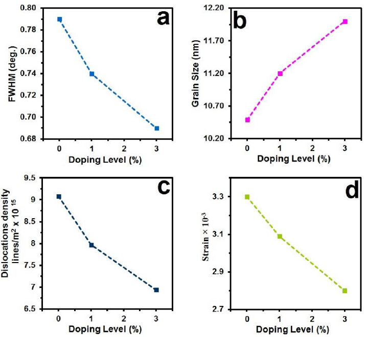 Furthermore, the determined parameters are given in Table 1. The strain and dislocation density esteem that decreased with increasing In as a dopant in thin films. The lower ‘δ’ for 3% confirms decreasing of defects and improving crystalline quality in the CdO thin films. The same as dislocation density, the minimum strain of prepared thin films attributed to 3% of In-doped CdO thin films. Fig. 2 shows correlation between FWHM, Grain size, dislocation density, and Strain and different dosage of indium clearly.
