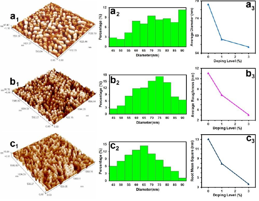 The surface topographical investigation for CdO and In-CdO was performed via atomic force microscopy (AFM) analysis. Fig. 3 shows the AFM images of CdO and In-CdO films for the various content of In as a dopant (0, 1, and 3 %). The nanostructure size and surface roughness of the grown films are presented in Table 2. Results display that the average diameter appears to be dependent on the In content. From Table 2, the particle size decreased from 78.05 to 65.77 nm when In content was increased from 0% to 3%. It is found that the roughness of the film was decreased to 3.03 nm via increasing In content to 3%.
