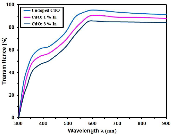 Fig. 4 demonstrated the transmittance spectra of the deposited films. The nano-sized CdO film displays transparency of 80 % which enhances to 95 % for 3 % doped-In. The absorption coefficient (α) of films was specified by equation [36]: