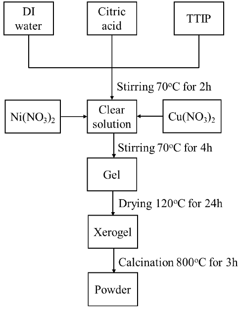 The NiTiO3 nanoparticles were synthesized by the citrate-gel method using nickel nitrate (Ni(NO3)2.6H2O), copper nitrate (Cu(NO3)2.3H2O) and titanium (IV) isopropoxide (C12H28O4Ti) as Ni, Cu, Ti sources and citric acid (C6H8O7) as a complexing reagent. Fig. 1 shows the schematic of the citrate gel process for the preparation of the Cu doped NiTiO3 powders. First, the C12H28O4Ti was dissolved in the C6H8O7 solution at 70 °C. A transparent homogeneous sol was formed after stirring vigorously for 2 h. Then, Ni(NO3)2.6H2O and Cu(NO3)2. 3H2O with equal moles of (Ni+Cu) and Ti was introduced. The resulting solution was continuously stirred for about 4 h to obtain a gel. The gel was oven dried at 120 °C for 24 h to obtain a xerogel. The xerogel was annealed at 800°C in air for 3 h and then milled in an agate mortar to get the powder samples. X-ray diffraction (XRD) pattern of the grilled powders was recorded via Philips X’PertPro X-ray diffractometer using a Ni-filtered Cu Kα radiation ( = 1.5406 Å) in range of 20°–70°. Field emission scanning electron microscopy images were obtained on JEOL JSM-7600F. The appearance of the chemical element in the final compounds of the sample powder was measured via energy dispersive X-ray spectroscopy (EDX). UV absorbances were determined on a UV–Vis–NIR spectrophotometer (Perkin-Elmer Lambda 1050). The Raman spectra were recorded via micro Raman spectrophotometer (JASCO Raman NRS-3000) using 633 nm excited laser at room temperature.
