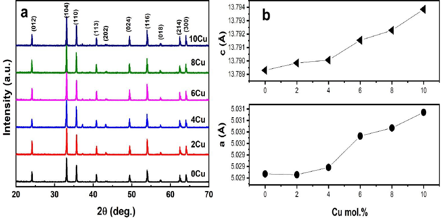 Fig. 2a shows the XRD patterns for the synthesized powders annealed at 800°C for 3 h. The main diffraction peaks at = 24.03°, 32.99°, 35.55°, 40.76°, 49.34°, 53.90°, 57.35°, 62.35°, and 63.97° of all undoped and doped samples agreed well with standard JCPDS data (no. 83- 0198) for the rhombohedral crystal structure R-3 space group. These values indicated the ilmenite structure of synthesized powders. All samples included the diffraction peaks at 2q = 24.03°, 32.99°, 35.55°, 40.76°, 49.34°, 53.90°, 57.35°, 62.35°, and 63.97°, corresponding to the lattice planes of (012), (104), (110), (113), (024), (116), (018), (214), and (300), respectively.