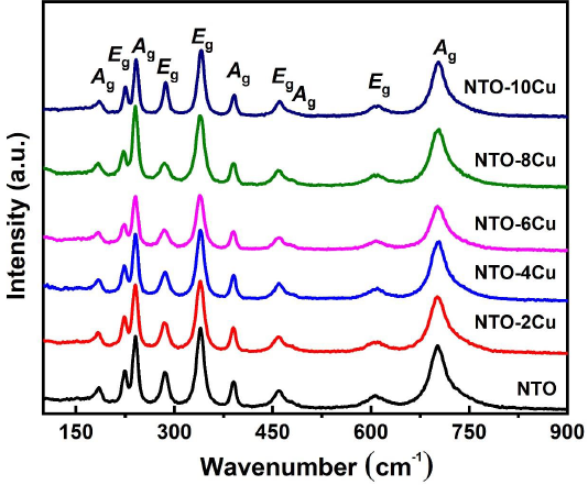 The results of XRD analysis indicated that the pure NiTiO3 phase was obtained when the samples were annealed at a temperature of 800oC for 3 h in air. To corroborate the results of XRD analysis, Raman spectroscopy was used to analyze the vibration properties of the fabricated powders. Analysis of Raman scattering spectra can give more evidence of structural changes, crystalline vibrations and distortions of the crystal lattice besides XRD analysis. Fig. 3 shows the Raman scattering of NiTiO3 samples annealed at temperatures of 800oC. The theoretical calculation indicated that the optical normal modes of vibrations have symmetries represented by 5Ag + 5Eg + 4Au + 4Eu, where 5Ag + 5Eg are ten active Raman modes, 4Au + 4Eu are inference active modes, and Au + Eu are two modes inactive in both Raman and inference modes [24–26]. Therefore, ten Raman active modes are expected with each Eg mode being twofold degenerated to E1g+E2g along with the eight IR active modes 4Au + 4Eu [26]. The bands located at 608 cm-1 and 704 cm-1 are described to the stretching of Ti–O and bending of O–Ti–O bonds [17]. The band at 227.6 cm-1 can originate from the asymmetric breathing vibration of the oxygen octahedral; the ones at 290.2 and 434.3 cm-1 can be attributed by the twist of oxygen octahedral due to the vibrations of the Ni and Ti atoms parallel to the xy plane; the Eg modes at 463.4 cm-1 and 609.7 cm-1 are assigned to the asymmetric breathing and twist of the oxygen octahedral with the cationic vibrations parallel to the xy plane [26]. Our result indicated that the Raman spectra were considerably dependent on the copper dopant content. A slight decrease in Raman shift to the lower frequency was observed in Raman spectra of Cu-doped NiTiO3 samples. This shift might be due to bigger ionic radii of Cu+2 ion replace at Ni+3 site in the lattice of NiTiO3. The substitution of Cu at this site caused the lattice expansion and increased the bond length between cations. The Raman band at 700 cm-1 was detailly analyzed and shown in Table 1. The shift of peak position to lower frequency, reduction in the intensity of the peak, and a wider the FWHM value of peak revealed the change in structure of NiTiO3 with presentation of copper dopant (as in Table 1). They indicated the stronger structural disorder, which could be due to the copper substitution in NiTiO3 lattice and caused the local distortion of lattice. By combination between XRD and Raman analysis, we can confirm that the Cu dopant substituted at Ni site in the lattice of NiTiO3 and caused the distortion in lattice crystal of NiTiO3.