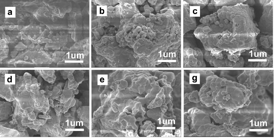 Figs. 4a–4g show the surface morphology of undoped and Cu doped NiTiO3 annealed at 800°C. The particles in all samples had irregular shape and were almost similar among all samples. Fig 5a shows the dependence of particle size on the Cu doping content. The results showed that the average particle size tend to increase with increasing of Cu content. The particle size of undoped sample is about 250 nm. This value increased to about 300 nm of Cu doped 10 mol.% NiTiO3 samples. Copper dopant acted as sintering aid, helping the rising both in crystalline size and particle size of NiTiO3 material. To confirm the copper dopant substitution in the NiTiO3, EDX analysis was used to check the all elements in synthesized samples. The EDX of 2 mol.% Cu-dopant in NiTiO3 was shown in Fig. 5b. It is confirmed that all expected elements appeared in the EDX result which reveals that the Cu doping doped into the NiTiO3 lattice.