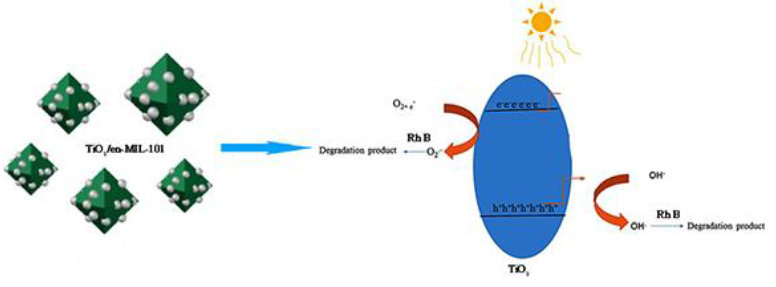 In this study, first en-MIL-10 (Cr) were synthesized by hydrothermal method and then placing of TiO2 into structure of en-MIL-101(Cr) photocatalysts were prepared and were used for degradation of Rhodamine B by visible and Uv light. Hetrostructure photocatalysts were confirmed by XRD, FE-SEM, TEM, Uv−vis DRS and FT-IR analyses. Stabilizing TiO2 nanoparticle into the en-MIL-10 (Cr) caused increased the surface area of the photocatalysts which increased higher and more adsorption of the rhodamine B over the photocatalyst surface. The photocatalytic activity results showed that the TiO2/en-MIL-101(Cr) enhancement photocatalytic activity and stability in the degradation of Rh B than to TiO2 nanoparticles. Due to its high activity, such as high surface area of the photocatalysts, low-cost and low electron/hole recombination, the TiO2/en-MIL-101(Cr) is an excellent photocatalyst for the photodegradation of organic pollutants in wastewater under UV and visible light. This work provides a new method using TiO2/en-MIL-101(Cr) under UV and visible light for photodegradation of organic pollutant for environmental purification.