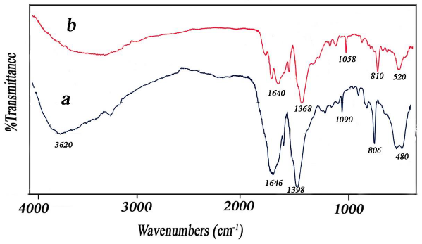 The FT-IR spectra of en-MIL-101 (Cr) and TiO2/en-MIL-101 (Cr) are given in Fig. 3. For en-MIL-101 (Cr), the peak at 3620 cm-1 is clearly observed, which is related to the asymmetrical stretching vibration of the amine groups. In the lower frequency region, the peak around 1640 cm-1 related to the N–H bending vibration. The absorption bands revealed at 1640, 1646, 3607 and 3620 cm-1 are related to the bending and stretching vibration modes of the hetrostructure water. The peaks at 1058cm-1 and 520 cm-1 shows that a Ti–O stretching into the structure of en-MIL-101 (Cr) hetrostructure. The broad strong band below 1100cm-1 is due to Ti-O-Ti vibration. In the region below 1000cm-1, band of Cr-O appears about 480 cm-1.