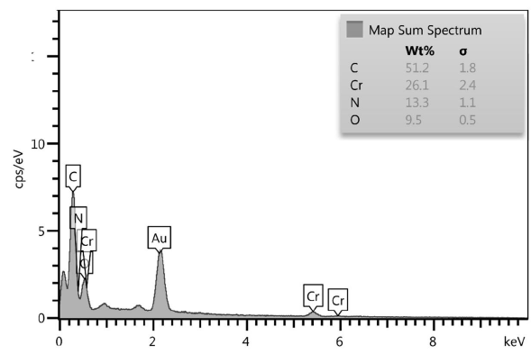The EDS data of en-MIL-101 (Cr) hetrostructure sample is shown in Fig. 4. The EDS spectrum shows that the sample is composed of O, N, Cr and C in the catalyst structure. Since in coating by Au for preparation of EDS and SEM images, some peaks appear in the spectrum.
